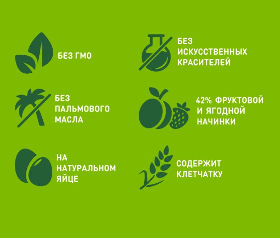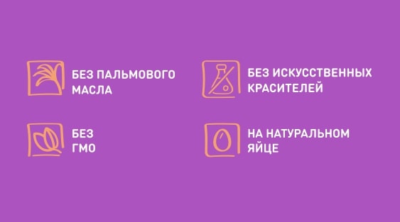 БЕЗ пальмового масла – используется высокоолеиновое подсолнечное масло, которое полезно для организма. Благодаря этому наши мягкие десерты насыщены витамином Е, Омега-3 и Омега-9-кислотами.